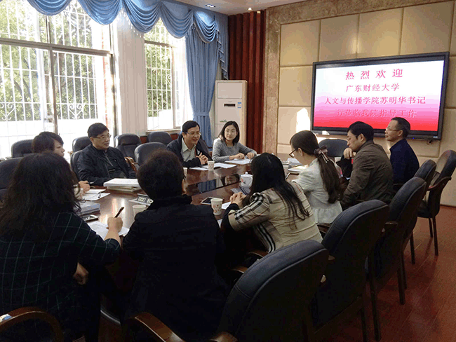 (通讯员:彭丽)10月31日上午,广东财经大学人文与传播学院党委书记苏明华一行来我院考察并开展“人文素质教育”专题调研。调研会在我院二楼会议室举行,副院长肖燕雄、闵素芬出席会议。