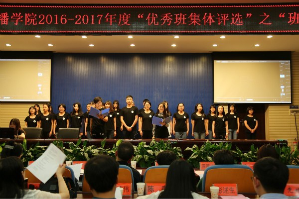 (通讯员 马苏雯 邓俪佳) 6月6日晚,我院2016-2017年度“优秀班级体评选”之“班级风采展”在书山论坛举行,14级新闻班、14级广电班等九个入选班级参与此次评选。院党委副书记王云,学工办主任欧阳丹玲,院团委书记陈淼,院团委副书记张磊、学工办老师彭述生、曹竞婧以及14级广电班班导李琦教授、14编导二班班导丁忠伟老师、15编辑班班导陈鸿平教授、15广告班班导曾琼副教授等领导老师出席此次活动。到场领导和学生代表担任活动评委。