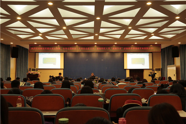 谭健分享了他对于新媒体快速发展所带来影响的思考。他提出,新媒体的快速发展改变了新闻理念、新闻价值、新闻传播模式以及新闻文体。新闻已从原来的满足求知欲变为了现在的满足用户消费,企业媒体化、媒体企业化的趋势日益增强。他以《总裁读书会》为例,通过对比“今日头条”等媒体的新闻标题,指出新媒体具有更加博人眼球的优势。传播模式方面,谭健认为新媒体快速发展使得新闻传播方向由单向变为双向,传播行为更为个性化,接收方式由固定变为移动,内容由单一到交融,传播速度更加快捷,较之传统媒体可谓是全新的。新闻文体方面,谭健指出新闻和评论两者的界限由清晰逐渐变模糊,形成了新闻评论这一新媒体普遍使用的文体。整个讲座,谭健将军以十分丰富的实战经验和极具高度的视野,从新闻理论原理出发,对新媒体语境下的新闻传播现象进行了凝练,对传统媒体与新媒体进行了比照审视,理论和实践结合,深厚学理和缜密思考结合,形成了自己的独特认识,给人以深刻启发,为我们认识和研究新媒体环境下的新闻现象提供了新视角、新思维。