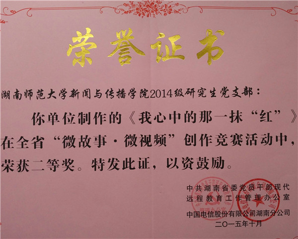 11月2日,湖南省党员教育工作座谈会在长沙召开。会议总结表彰了全省党员教育学用工作和“微故事﹒微视频”创作竞赛活动。我院2014级研究生党支部凭借视频《我心中的那一抹“红”》,荣获湖南省二等奖。