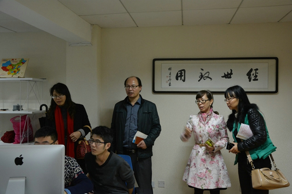 肖燕雄、闵素芬陪同贺卫国一行参观了我院的CATI室、网络传播工作坊、媒介创意工作坊、新媒体苹果机房等教学科研场地。恰逢2012级编导班正在新媒体苹果机房进行毕业展映的筹备,贺卫国饶有兴致地观看了同学们剪辑视频的过程,并对我院这类以学生为主的实践活动大加赞赏。王云副书记同欧阳书记就学生党建工作进行了交流。