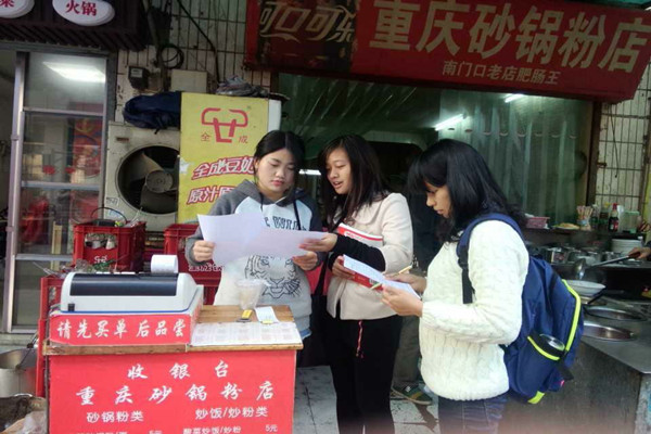 由于当前学校、宿舍周围的食品安全问题较为突出,一部分志愿者特地到德智小吃街的各个店面进行食品安全的宣传,并且对每个店铺的食材、餐具、卫生做了认真详细的调查探访。调查发现大量店铺存在卫生问题,志愿者们积极与老板沟通,并提出整改建议。大部分店铺比较配合,也有少数拒不理睬,志愿者们最终将结果反馈给了同学们,为同学们外出就餐提供参考。