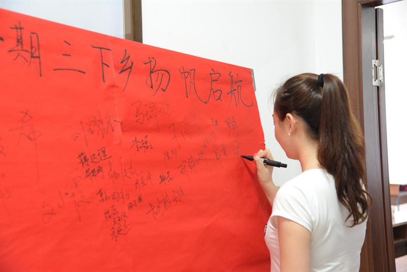 仪式开始前,本年度三下乡队员们在签字板上签了名字,决心用饱满的姿态迎接即将到来的三下乡活动。仪式开始后,院团委副书记雷蕾进行发言,介绍了本年度各实践团队的情况和注意事项,队员们注意聆听并认真记录。队长代表张德智致宣誓词,带领队员们宣誓,队员们严肃认真,用昂扬的精神进行宣誓。宣誓后院党委彭露副书记进行动员讲话,彭书记就安全问题,宣传问题等做出强调,她希望,队员们能有一个安全,难忘的三下乡。