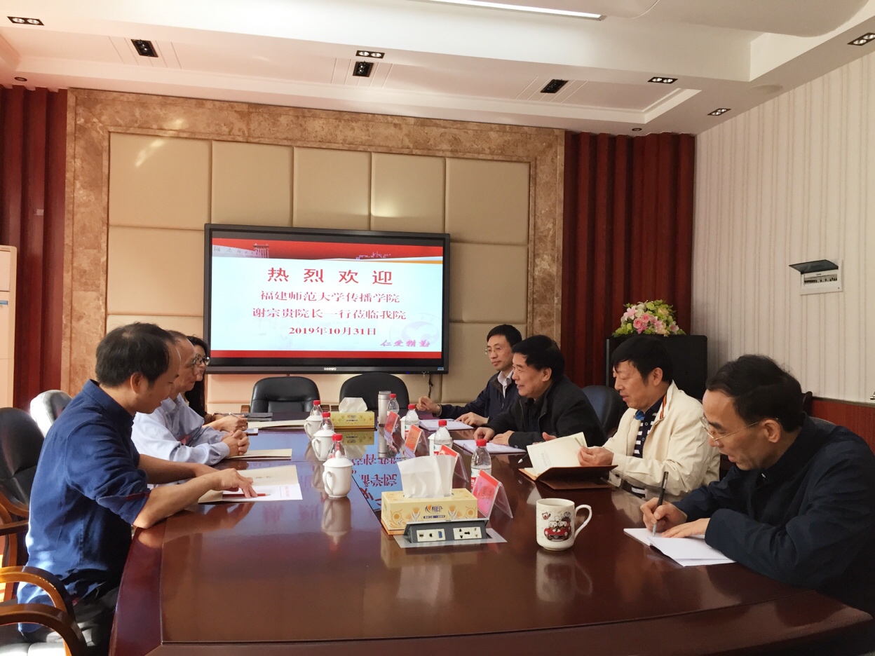(通讯员 彭丽)10月31日上午,福建师范大学传播学院院长谢宗贵一行三人来我院考察交流。座谈交流会在学院二楼会议室举行,院长尹韵公,院党委书记李正益,副院长肖燕雄、周国清出席会议。 尹韵公对谢宗贵一行表示热烈欢迎,并介绍了我院的发展历程、学科建设、师资队伍建设等方面情况。肖燕雄、周国清分别具体介绍了本科人才培养和部校共建工作情况。 谢宗贵对我院的热情接待表示感谢,对我院近年来所取得的发展成绩表示高度赞赏,他还介绍了福建师范大学传播学院相关发展情况。