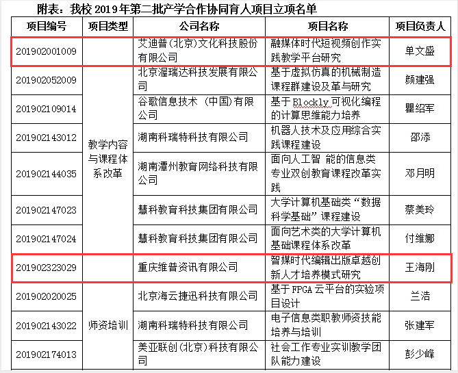 (通讯员 林芳)近日,教育部发布了《教育部高等教育司关于公布2019年第二批产学合作协同育人项目立项名单的通知》(教高司函﹝2020﹞6号),我校有18个项目获批立项,我院有4个项目获批立项,单文盛老师负责的《融媒体时代短视频创作实践教学平台研究》和王海刚老师负责的《智媒时代编辑出版卓越创新人才培养模式研究》获教学内容和课程体系改革类立项,单文盛老师负责的《“书山云”县级融媒体实验平台》和刘振老师负责的《新闻传播数据可视化教学实践平台》获实践条件与实践基地建设类立项。