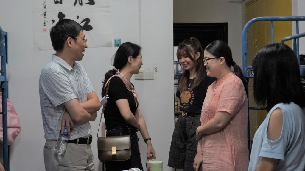院长尹韵公与新生交流有关家乡的内容,了解新生的住宿感受,关切宿舍的配套设施,询问空调和生活用品的使用情况,强调和谐的室友关系;副院长肖燕雄关心学生的心理感受,嘱咐学生离家在外多联系家长,有任何问题及时联系辅导员;党委副书记王云对安全问题着重强调,外出等特殊情况需要跟辅导员报备,倡导学生建立寝室文化,营造良好的寝室氛围,向16级“学霸寝室”学习;副院长闵素芬夸奖新生肯吃苦耐劳的品质,有时间多运动,提高身体素质。