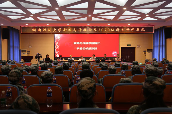 新闻学系系主任吴果中、广播电视系系主任王文利、广告系系主任王战、网络与新媒体系系主任燕道成、编辑与出版系系主任王海刚、广播与电视系副主任颜湘君、教授徐新平、20级班导师、各级辅导员、新生军训教官和20级全体新生参加此次大会。