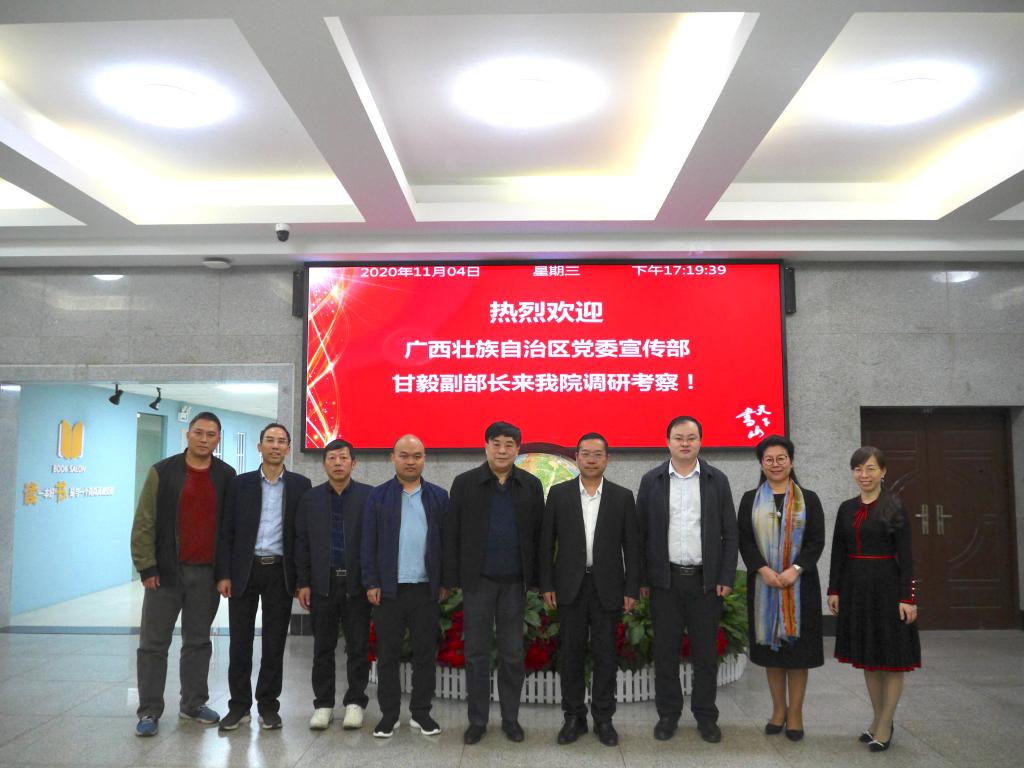 (通讯员 肖菲宇)11月4日下午,广西壮族自治区党委宣传部副部长甘毅一行四人来我院考察交流。座谈交流会在学院二楼会议室举行,会议由院党委书记李正益主持,湖南省记协副秘书长邓彪,广西壮族自治区党委宣传部新闻处主任科员余雄,广西民族大学主任播音员杨学明,院长尹韵公,副院长周国清、闵素芬,部校共建联络员单文盛出席会议。
