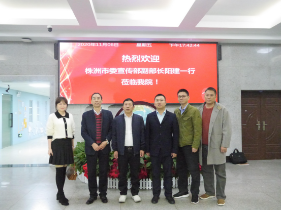 (通讯员 徐璐)11月6日下午,株洲市委宣传部副部长阳建、株洲市委宣传部新闻和传媒监管科科长沈徽莅临我院,就共建县级融媒体产教协同育人实践教学基地项目进行考察并召开座谈会。会议由院党委书记李正益主持,副院长周国清、英国官方365上市县级融媒体建设研究中心执行主任方提、英国官方365上市县级融媒体建设研究中心秘书长单文盛参与了此次座谈会。