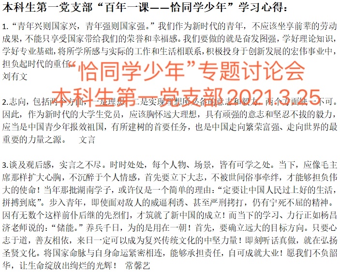 全体党员认真学习了习近平总书记在党史学习教育动员大会上的重要讲话精神,按照学校和学院的安排,观看了“就认这个理——百年一课《恰同学少年》”专题片,接着展开积极地讨论,并撰写学习心得。
