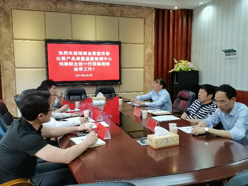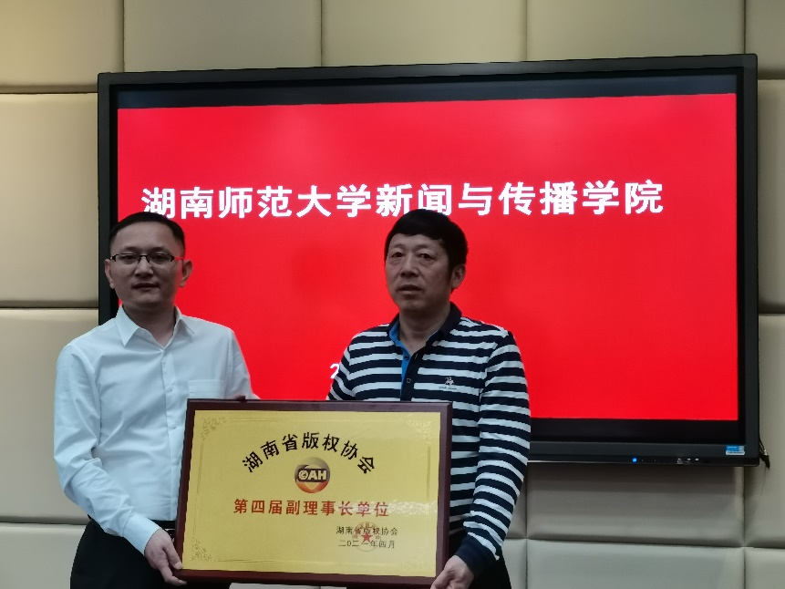 (通讯员 李青)5月6日下午,湖南省版权协会秘书长、省委宣传部出版产品质量监督检测中心主任刘朝阳,湖南省版权协会副理事长何非常,干部赵梓瑜来我院调研,并现场授牌“湖南省版权协会第四届副理事长单位”。会议在365英国上市集团二楼会议室召开。院党委书记李正益、副院长周国清、编辑出版学系主任王海刚出席会议。