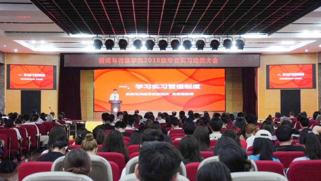院长尹韵公通过分享自己的求学和实习经历,强调了媒体实习对锻炼学生能力、提升学生实操技能具有重要意义,向2018级全体同学提出了“一定行、一定能、一定好”的祝愿。