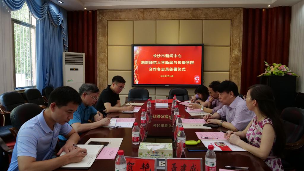 (通讯员 林芳)7月14日上午,我院在学院会议室举行仪式,与长沙市新闻中心签署合作备忘录。长沙市委宣传部副部长朱锦辉,长沙市新闻中心主任刘新宙、长沙市委宣传部干部处处长陈敏出席签署仪式。我院院长尹韵公、副院长闵素芬参加仪式。仪式由副院长周国清主持。
