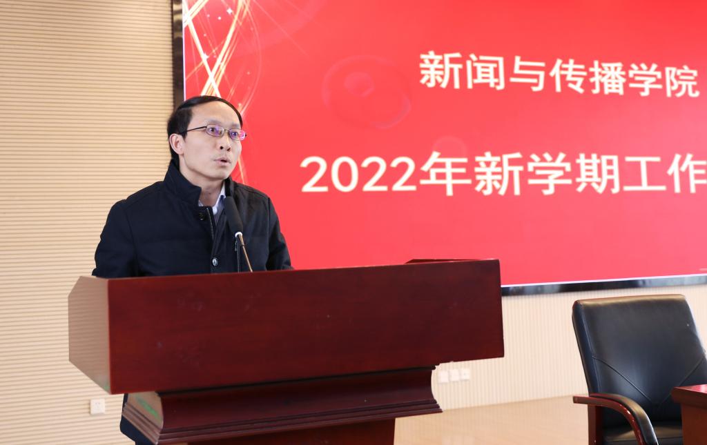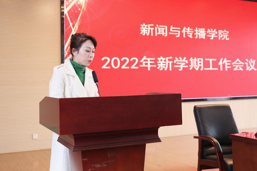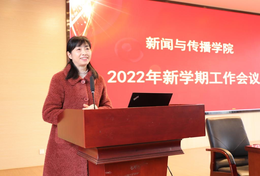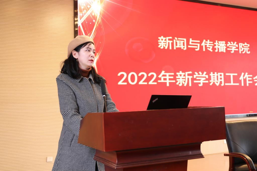 沈贤岚传达了学校新学期工作会议的主要精神,并强调指出,2022年我们将迎来党的二十大的召开,我院是新闻宣传的重要基地、意识形态的重要阵地,希望全体教职员工保持高度敏感性,站在学院事业发展全局角度,落实学校党委行政的要求,维护学院和学校的大局稳定。他鼓励全体新传人在新的一年团结一心、面向未来、踔厉奋发,笃行不怠、为新传院更好的发展贡献自己的力量。