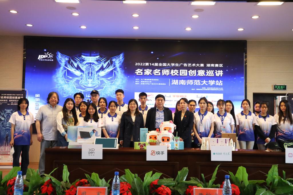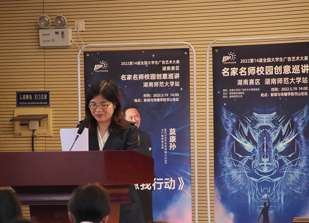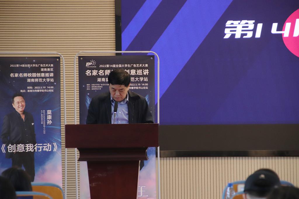 5月19日下午,第14届全国大学生广告艺术大赛湖南赛区名家名师校园创意巡讲会在书山论坛成功举行。湖南省教育厅高教处副处长周军,教务处副处长安宁,大广赛湖南赛区组委会副主任、院长尹韵公,院党委书记沈贤岚、副院长李琦、大广赛湖南赛区组委会秘书长、广告系主任王战参加巡讲会。巡讲会在优酷网设置了直播通道,全省各参赛院校组织师生进行了线上收看。