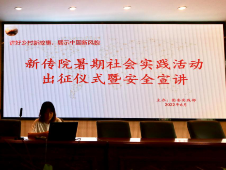 (通讯员 侯志刚 江圳)讲好乡村新故事,展示中国新风貌。6月24日中午,由团委实践部主办的“新传院暑期社会实践活动出征仪式暨安全宣讲”在书山论坛成功举办。正处级组织员王云、副院长李琦、党委副书记张小春、团委书记陈安琪,学工办宋嘉帅、贺静一出席此次活动。暑期社会实践活动的指导老师有:段峰峰、颜湘君、聂建成、熊敏、单文盛、陈璐、禹菲。