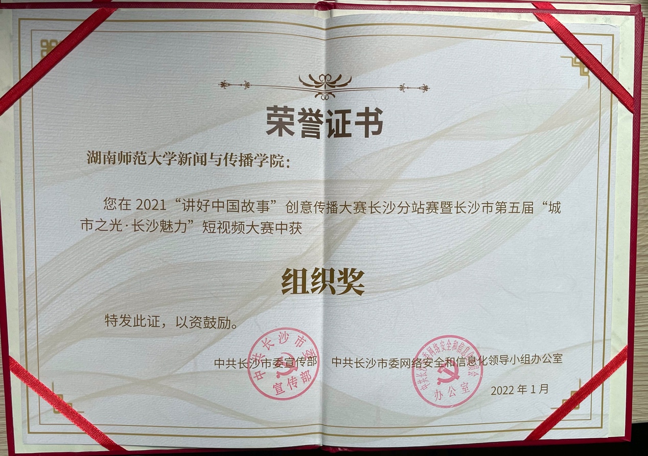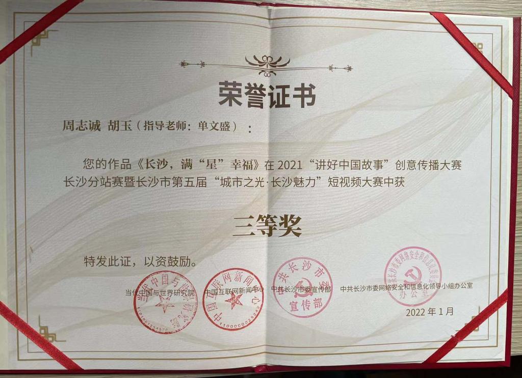 7月12日下午,由长沙市委宣传部、市委网信办主办,长沙晚报、腾讯·大湘网承办的2021“讲好中国故事”创意传播大赛长沙分站赛暨长沙市第五届“城市之光·长沙魅力”短视频大赛颁奖仪式在西湖公园长沙前行科创园路演大厅正式举行,我院获得组织奖,2020级网络与新媒体专业的周志诚、胡玉同学凭借其作品《长沙,满“星”幸福》获三等奖,指导老师为单文盛。