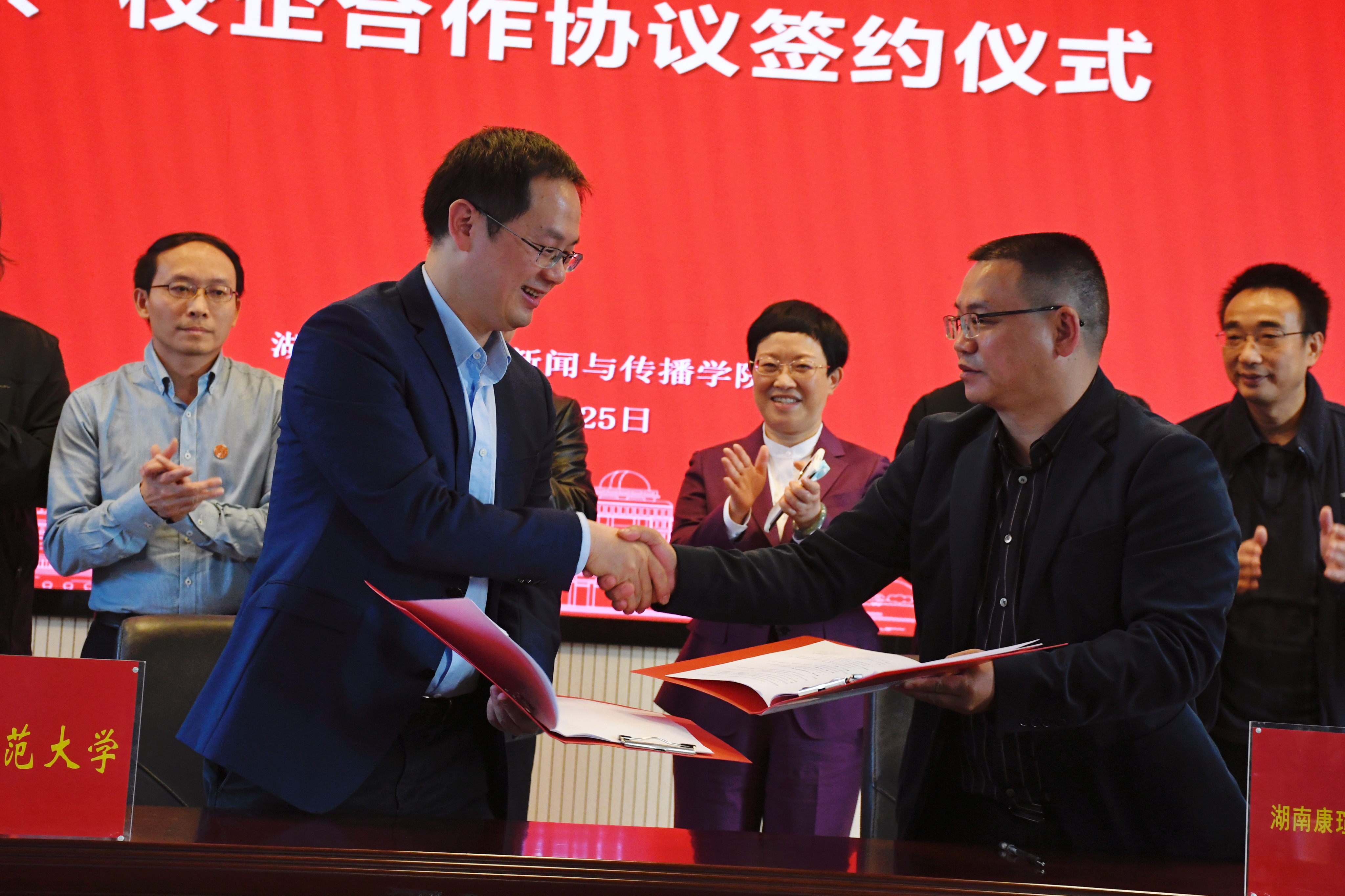在双方与会领导嘉宾的共同见证下,沈贤岚、王万千签署校企合作协议。唐贤清代表学校,为湖南康瑄科技有限公司“产学研合作基地”授牌并合影留念。