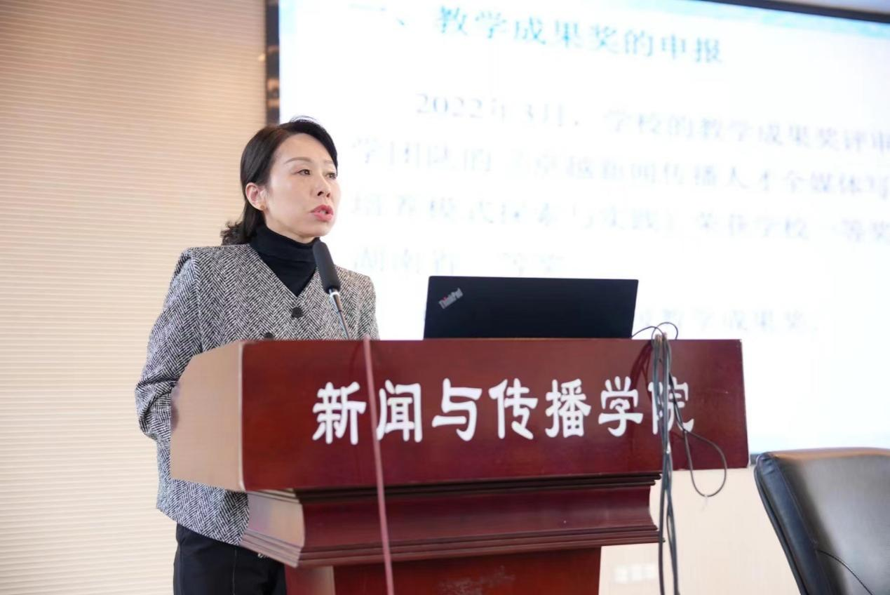 李琦就我院2022年度本科教学做工作汇报。她在报告中对2022年我院在教学成果奖申报、优化人才培养方案、进一流专业建设、本科课程建设、教改项目建设、青年教师教学竞赛、教学平台建设、优化学生培养环节、教学水平与质量监控九个方面所取得的显著成果进行了总结,并向学院老师的辛勤付出表达了感谢。最后李琦对学院教学管理中一些常见问题进行了讲解,并再次强调了教学管理纪律和要求。