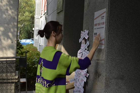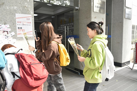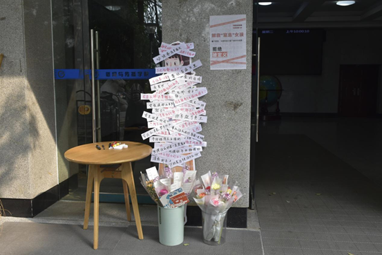 此次女生节活动主要包括标签互动板和温暖送花两个环节。新传院门口摆放有各色鲜花和贴满了社会对女性所持有刻板印象的人形立牌,女生们通过撕下人形立牌上的固有标签并写上自己的美好祝愿参与此次活动,同时挑选自己喜欢的花束作为活动礼品。