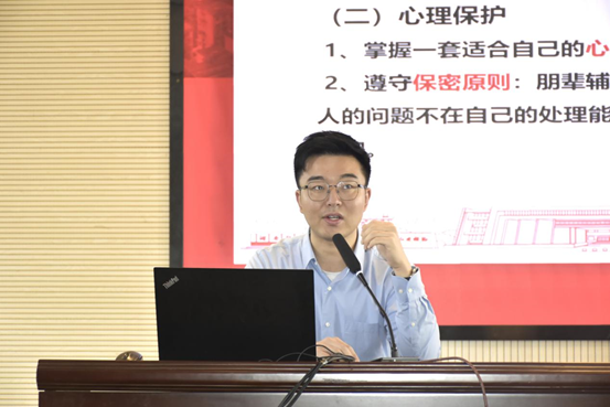 王洋从朋辈心理辅导概述、素质、态度、基本技能四方面向大家介绍和论述了如何做好一名朋辈心理辅导员。他表示,朋辈心理辅导员应该从被辅导者的角度出发,兼顾当事人所面临的情绪和实际,做好相关的心理舒缓工作,积极认真履行职责。