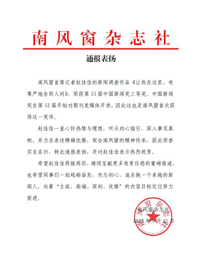 中国新闻奖是经中国共产党中央委员会宣传部批准常设、中华全国新闻工作者协会主办的全国优秀新闻作品最高奖项。赵佳佳的作品聚焦于三线小城的安宁疗护,以沧州市人民医院安宁疗护科室为模型,详细地阐述了普惠型安宁疗护的实践以及面临的困境,被认为是解困式报道的优质案例,得到了南风窗杂志社的通报表扬。希望赵佳佳再接再厉呈现出更多优秀的新闻作品,也期待我院学予以优秀学姐为榜样,追求成为卓越的新闻人。