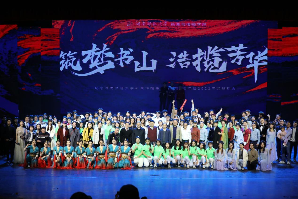 长沙实验剧场灯光璀璨,座无虚席。晚7时许,在2023级新生的开场舞《Yes or Yes》中,晚会拉开序幕。整场晚会以“筑梦书山·浩揽芳华”为主题,笑声泪点同穿插,学生老师齐参与。通过歌舞、朗诵、小品、情景剧、乐队表演等多种艺术形式,重现新闻教育三十年的栉风沐雨,回望严谨治学三十年的累累硕果。