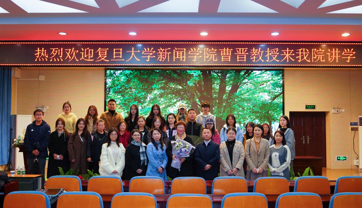 讲座结束后,曹晋收到学生敬献的鲜花,并与学院老师合影留念。