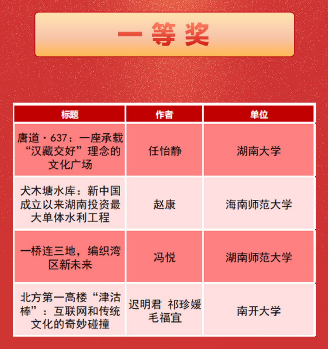 (通讯员 唐苗)2月25日,由湖南日报社举办的“新青年打卡新地标”大赛获奖作品名单揭晓。我院2022级网络与新媒体专业冯悦荣获一等奖,2023级新闻学专业何一苇、武雪乔同学分别带领的小组获二等奖,2023级新闻学专业刘雨薇、2023级全媒体新闻学专业张婧茹同学分别带领的小组获三等奖,2023级全媒体新闻学专业薛景文同学带领的小组获优秀奖。我院获奖数量与质量居参赛高校前列,充分展现了我院本科教育教学课程实践的教学成果。