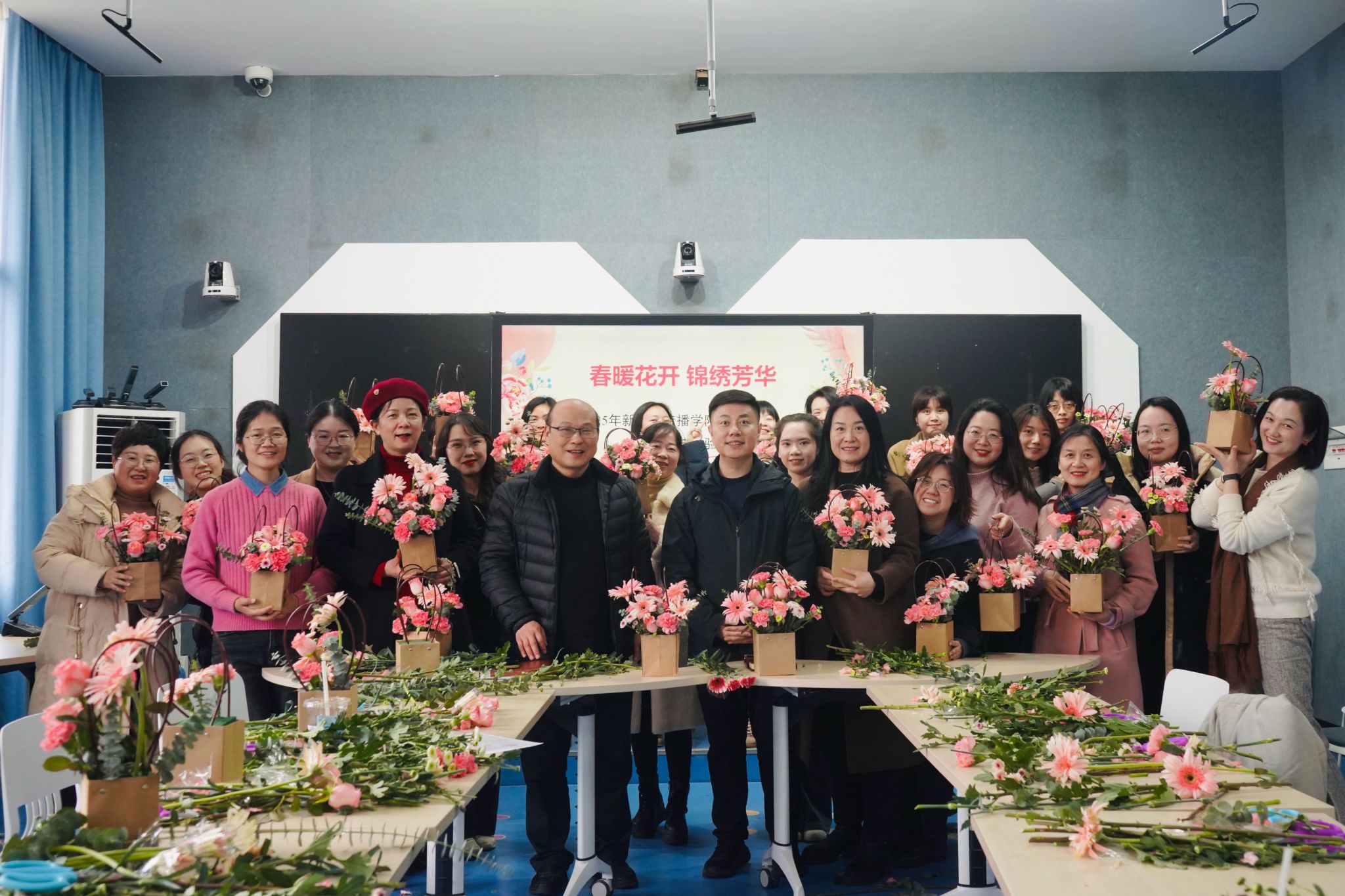 (通讯员 曾奕嘉)为庆祝“三八”国际劳动妇女节,进一步丰富女教职工的业余生活,提升生活情趣与审美素养,3月6日下午,院工会组织学院女教职工在学院402教室开展“春暖花开 锦绣芳华——女职工花艺体验活动”。此次活动得到院党委的大力支持和女教职工的热情响应,副院长周伊慧、副书记张小春全程参与活动,院长蔡颂、党委书记李泳波向女同胞致以节日的祝贺和亲切的问候。