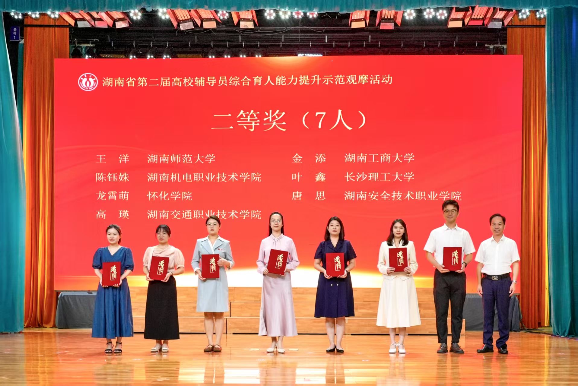 (通讯员 欧阳丹玲)5月20日至23日,湖南省第二届高校辅导员综合育人能力提升示范观摩活动在南华大学举行。经过激烈角逐,我院2022级辅导员王洋老师荣获二等奖。