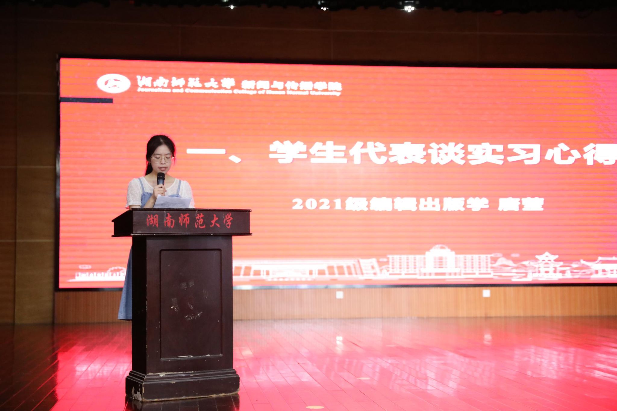2021 级编辑出版学专业唐莹同学作为学生代表上台分享实习心得。她以自身经历为切入点,深刻阐释实习是专业知识与行业实践的深度碰撞。她鼓励学弟学妹们在实习中完成从学生思维到职业身份的认知转变,尤其要注重锻造符合行业需求的硬核技能,以适应未来职场新挑战。