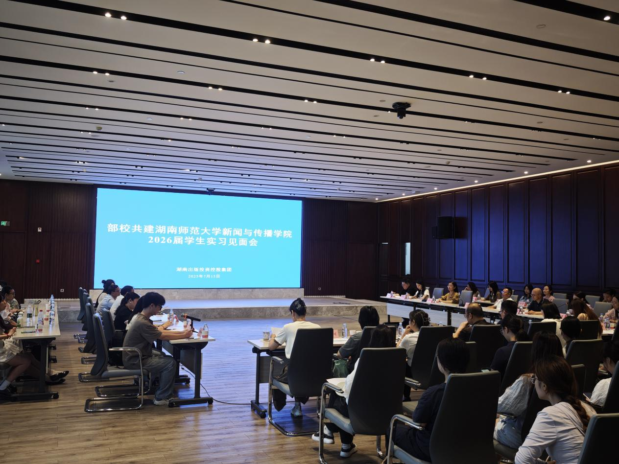7月15日上午,我院与湖南出版投资控股集团有限公司举行2026届学生实习见面会。湖南出版投资控股集团党委副书记、副董事长、总编辑、总经理杨壮,中南出版传媒集团股份有限公司总编辑谢清风,集团组织部部长文依平,集团党委宣传部部长佘璐,集团党委宣传部主管吴幸倬,我院党委书记王胜章,副院长王海刚,广告学系主任曾琼教授,编辑出版学系副教授吴亮芳,教务办主任彭丽,部校共建办主任王倩等参加了会议。湖南出版投资控股集团党委宣传部部长佘璐主持会议。