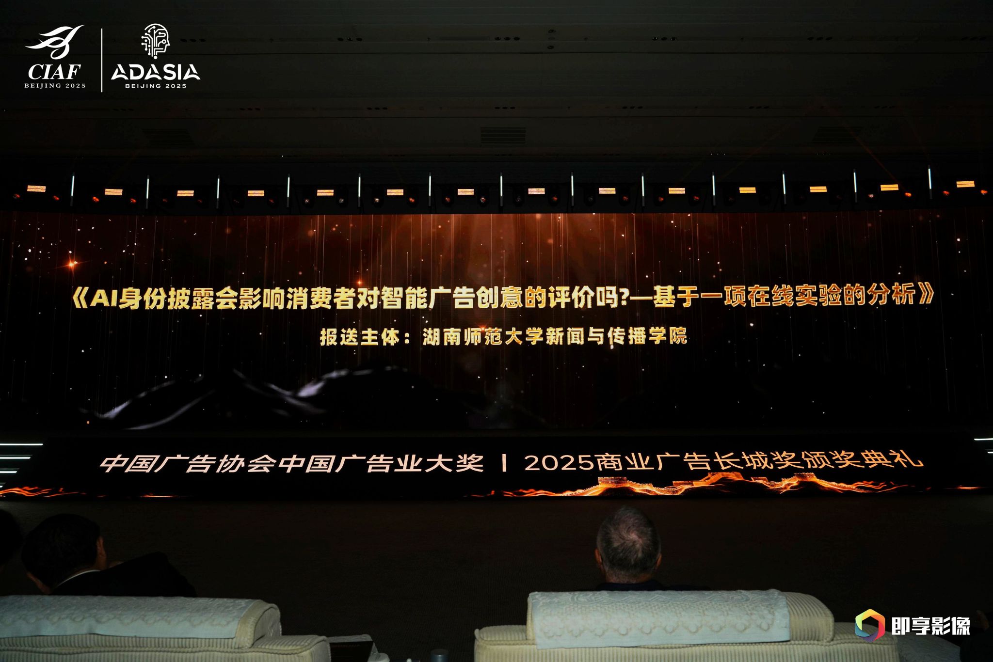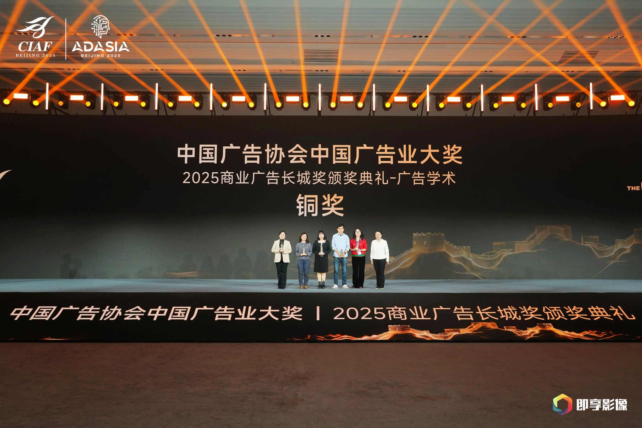 (通讯员 曾奕嘉 马源)2025年10月25日晚,中国广告业大奖·2025商业广告长城奖颁奖典礼在北京中关村国际创新中心畅春厅BC厅隆重举行。作为第32届中国国际广告节的核心活动之一,本届长城奖(广告学术类)等级奖名单现场揭晓,共产生五银五铜(金奖空缺),主办方为获奖者颁发了奖杯。365英国上市集团广告系主任曾琼教授及其2024级博士研究生马源发表于《新闻大学》2025年第5期的论文《AI身份披露会影响消费者对智能广告创意的评价吗?——基于一项在线实验的分析》荣获长城奖(广告学术类)铜奖。