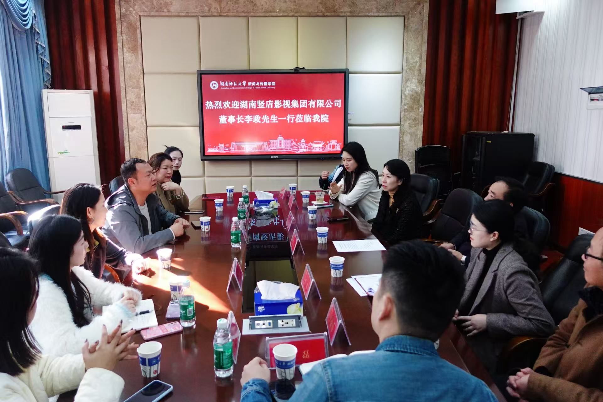 (通讯员 周露)12月1日下午,湖南竖店影视集团有限公司董事长李政一行六人莅临我院考察交流。我院党委书记王胜章、副院长李琦出席会议,视听传媒系教师朱奕亭、丁忠伟、石力夫、张磊参与交流,会议由视听传媒系主任岳璐主持。