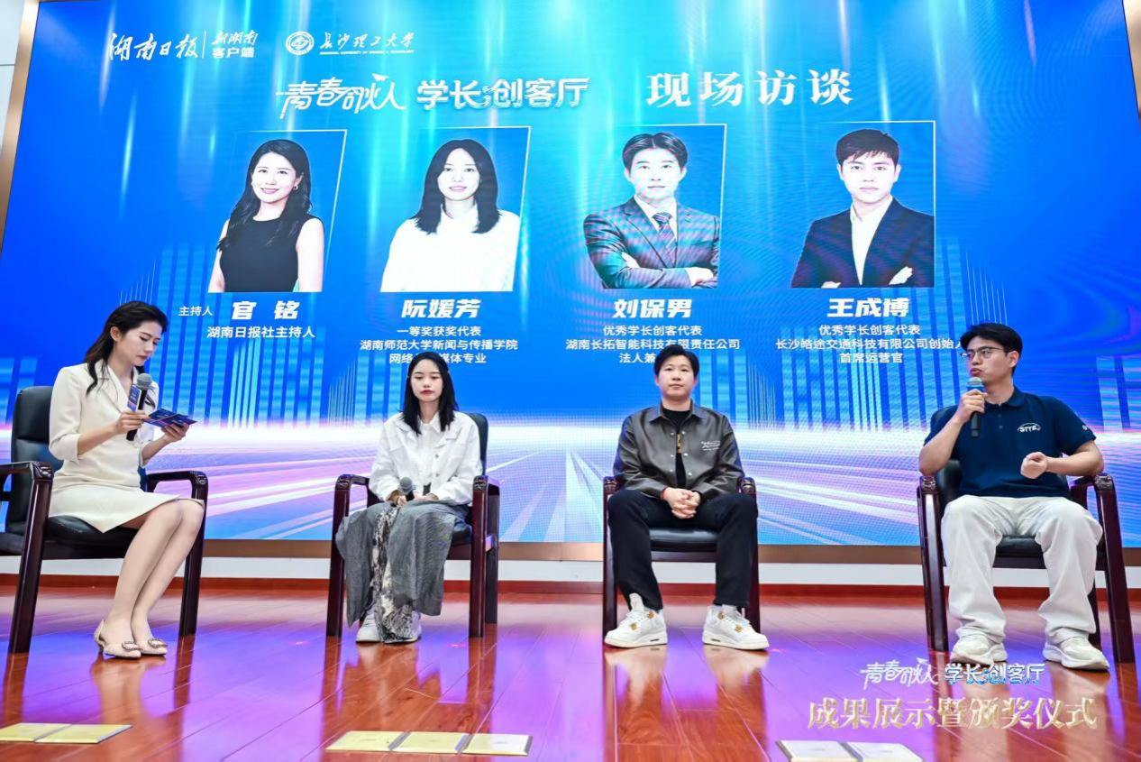 本次活动自2025年3月启动,在省委宣传部、省教育厅、团省委的指导和大力支持下,湖南日报社依托“青春合伙人”项目,推出“学长创客厅”主题报道行动。全省26所高校的新传学子用镜头记录下72期鲜活的创业故事,拼绘出湖湘青年奋发有为的青春群像。活动现场还举行了“学长创客厅”访谈,我院一等奖作品团队成员阮媛芳作为唯一参赛选手代表分享了创作经历,讲述了镜头背后的采访故事与青年视角下的创业观察。