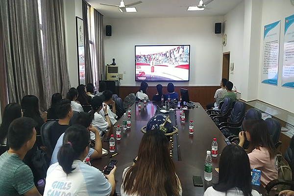 全体在家校领导和党群部门负责人在校办公楼二会议室组织观看庆祝活动。
