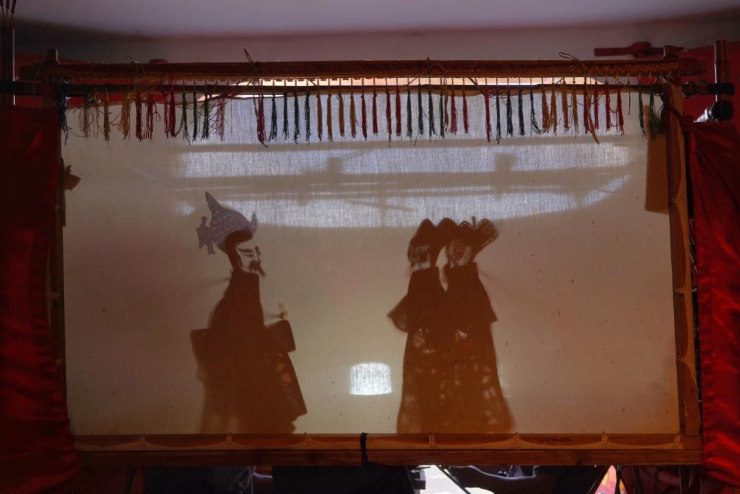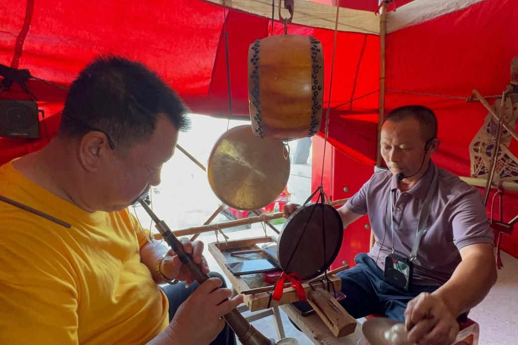 与他们往常的表演一样,在不到3平方米的舞台上,平江皮影戏非遗传承人方柯应稳坐后台,将鼓点敲得铿锵热烈;杨志平巧手翻飞,操纵着皮影人物在幕布上跃动;陈卫明拨动琴弦,与平江方言唱腔交织成曲。三位传承人默契配合,以“泰山了愿”的故事为引,让光影中的人物在乡土气息浓郁的唱述中栩栩如生。