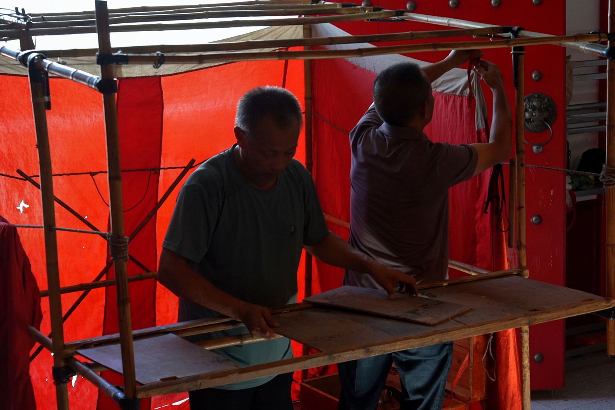 与他们往常的表演一样,在不到3平方米的舞台上,平江皮影戏非遗传承人方柯应稳坐台后,将鼓点敲得铿锵热烈;杨志平巧手翻飞,操纵着皮影人物在幕布上跃动;陈卫明拨动琴弦,与平江方言唱腔交织成曲。三位传承人默契配合,以“泰山了愿”的故事为引,让光影中的人物在乡土气息浓郁的唱述中栩栩如生。