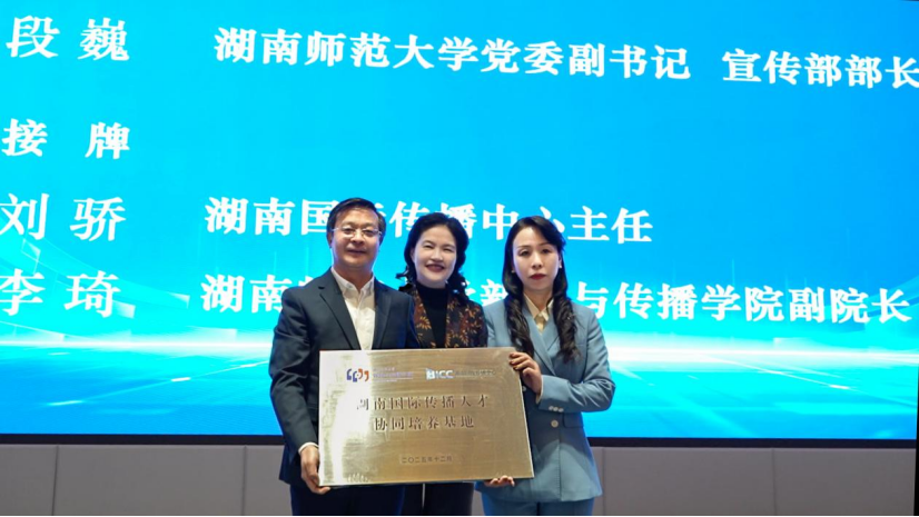 开幕式上举行了授牌仪式。英国官方365上市党委副书记、宣传部部长段巍向湖南国际传播中心主任刘骄、365英国上市集团副院长李琦共同授予“湖南国际传播人才协同培养基地”牌匾。该基地的成立,标志着高校学术资源与地方媒体平台进入实质性协同阶段,将为学生的专业实习、项目实践、课题研究及师资互聘提供稳定平台。