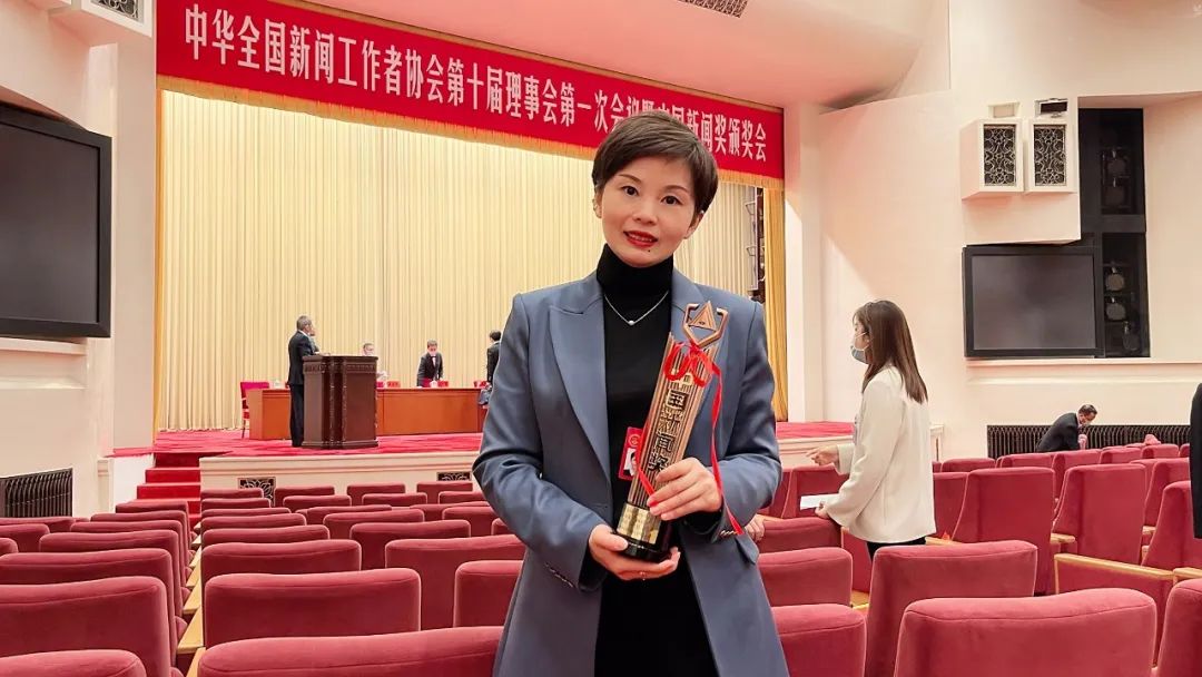 手捧第三十一届中国新闻奖一等奖奖杯的阳玲