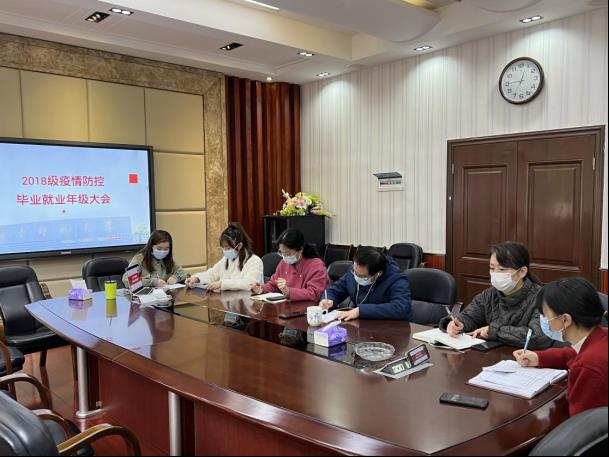 2018级辅导员陈安琪根据现有情况,就科学抗疫、就业形势、理性就业、顺利毕业四个方面进行强调。指出疫情期间每一个人都是自己健康的第一责任,毕业生们更需坚持严格按照疫情防控具体要求做好健康检测、请销假制度等事项;介绍了学院目前的就业形势和就业现状,以及毕业生需要重视并做好的毕业档案等工作。同时表示就业时机宝贵、毕业事物繁杂,同学们的压力不小,希望大家接下来能保持积极的心态,顺利地毕业、就业。
