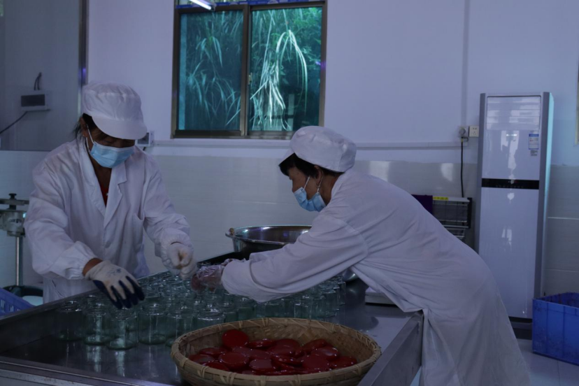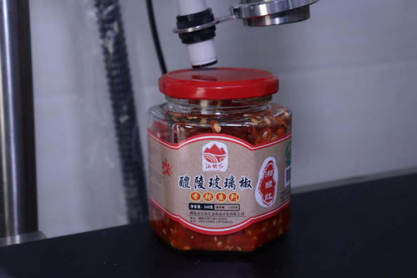 “辣椒绞碎需要反复多次。”工人向成员们介绍道。辣椒绞碎十分关键,反复进行绞碎是为了后续的酱椒工序打基础,充分绞碎才能确保最后的成品足够入味,达到剁辣椒制品的质量标准。剁辣椒包装瓶和瓶盖在无菌车间内使用酒精杀菌后投入生产线,进行剁辣椒灌装、封盖、贴标和喷码。