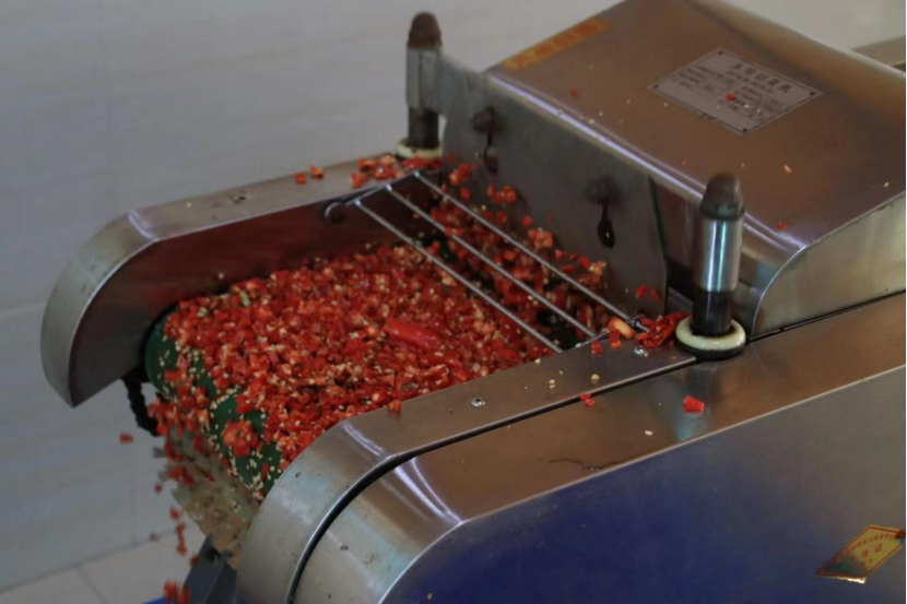 剁辣椒生产共有6道工序,分别是原椒绞碎、酱椒、灌装、封盖、贴标、喷码。据工人介绍,为防止玻璃椒制品“剁辣椒”腐坏,玻璃椒在进入生产车间之前都会晾晒两至三小时进行原椒沥水,所有玻璃椒都要在精选、去蒂、清洗后方能流入生产线。