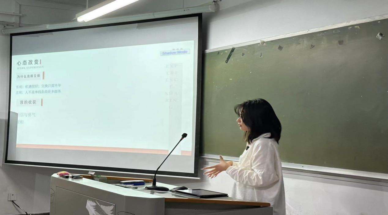 朱绍涵讲述了交流基本情况、课程学习分享,在人大学习的心态改变以及生活经历分享四个方面的内容。