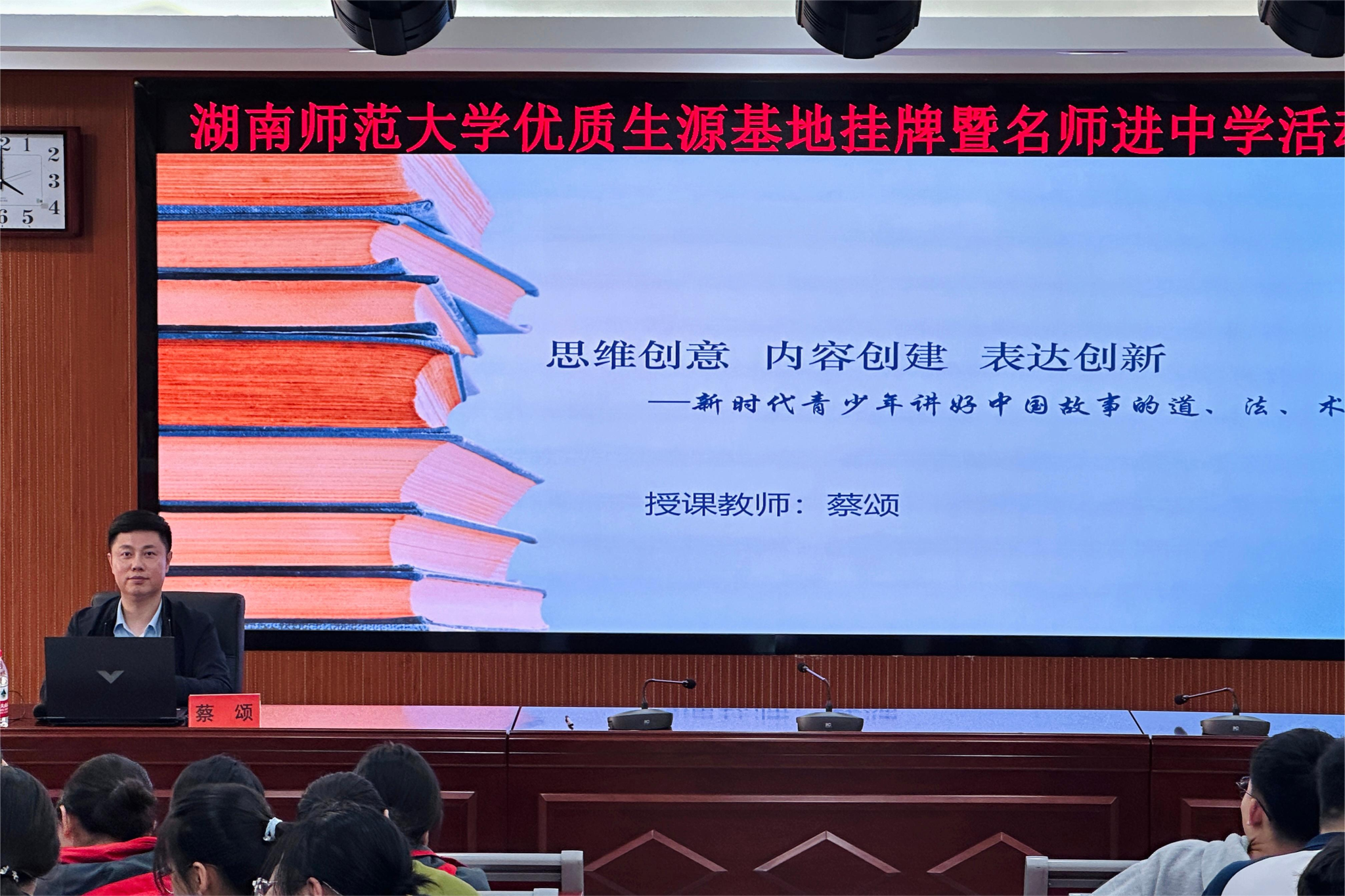 授牌仪式结束后,蔡颂教授为宁远一中学子做《思维创意、内容创新、表达创新——当代青年讲好中国故事道、法、术》的主题讲座。“讲好故事,事半功倍。”讲座结合语言学、传播学、艺术学等相关学科知识,从思维创意、内容创建、表达创新三个方面,引导大家在掌握“讲好中国故事的道、法、术”之基础知识及实践技能的同时,切实提升“语言”“思维”“审美”“文化”四个维度的核心素养。他指出,作为新时代的青年,应当肩负起传承和弘扬中华文化的重任,通过创新思维和创意表达,将中国故事传递给更广泛的受众。他分析了当前中国故事的传播现状和存在的问题,提出了思维创意、内容创新、多元化表达的必要性。他鼓励学生们打破传统思维模式,通过批判性思维发现新的观点和见解,深入挖掘中国文化的深层内涵,将其与现代元素相结合,创作出具有时代感和吸引力的故事内容。蔡颂教授鼓励学生们将所学应用于实际,积极参与中国故事的传播工作,为提升国家文化软实力贡献青春力量。