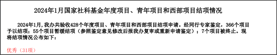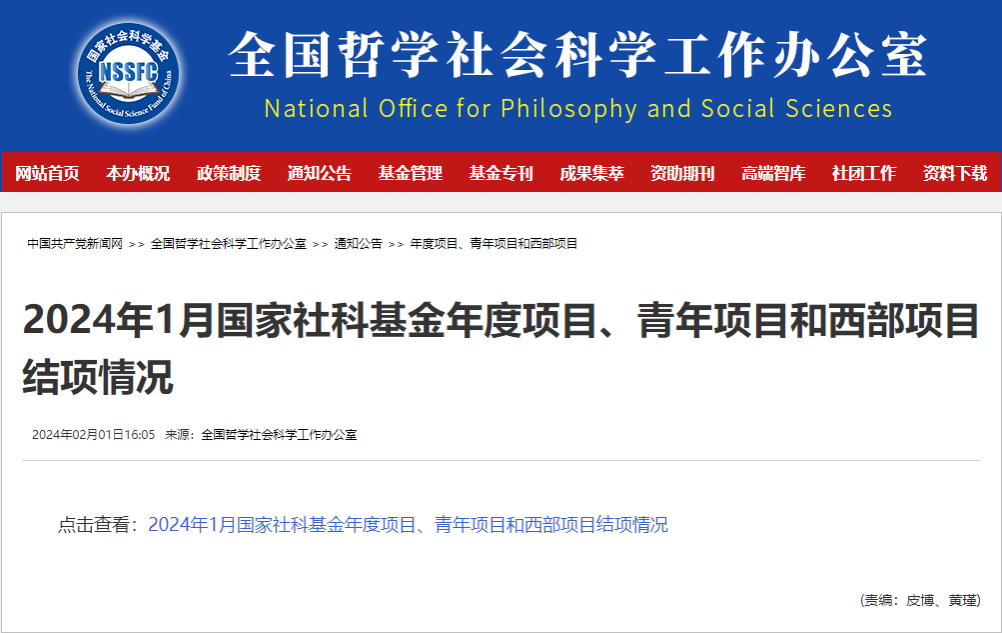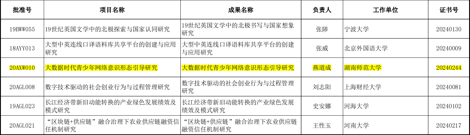 近期,全国哲学社会科学工作办公室公布了2024年1月国家社科基金项目结项名单。我院燕道成教授主持完成的国家社科基金重点项目研究成果《大数据时代青少年网络意识形态引导研究》顺利通过国内同行专家鉴定,经全国哲学社会科学工作办公室审批,获评“优秀”等级。