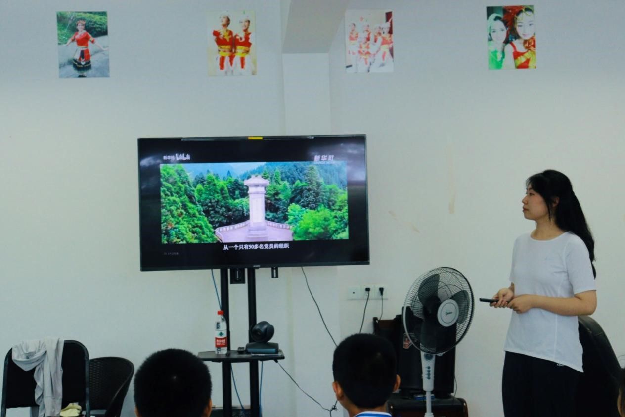 党建教育过程中,队员回顾了中国革命历程,讲解了中国共产党的组织发展过程,为乡村孩子埋下红色基因的种子。在教学中,队员积极与学生互动,以生动、有画面感的语言进行介绍,通过提问的形式进行课堂回顾,激发学生对党建历史的兴趣,通过多媒体视频+讲解的方式增进学生对红色文化的了解。学生们积极举手提问和抢答,对此次课堂显现出热情。