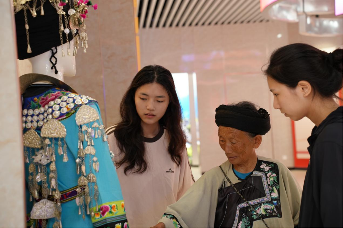 当地身着苗绣服装的老人正在向团队成员讲解苗服知识