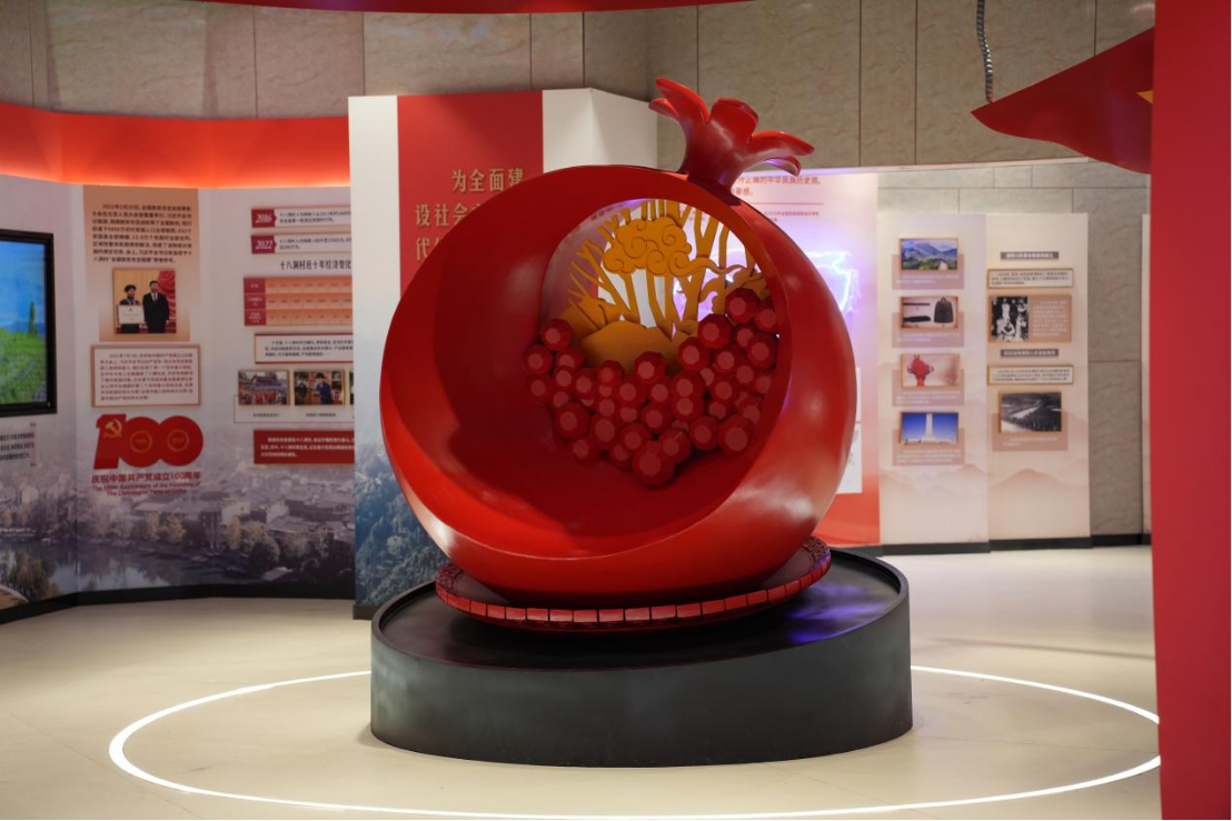 铸牢中华民族共同体意识教育基地展厅陈列的“红石榴”雕塑